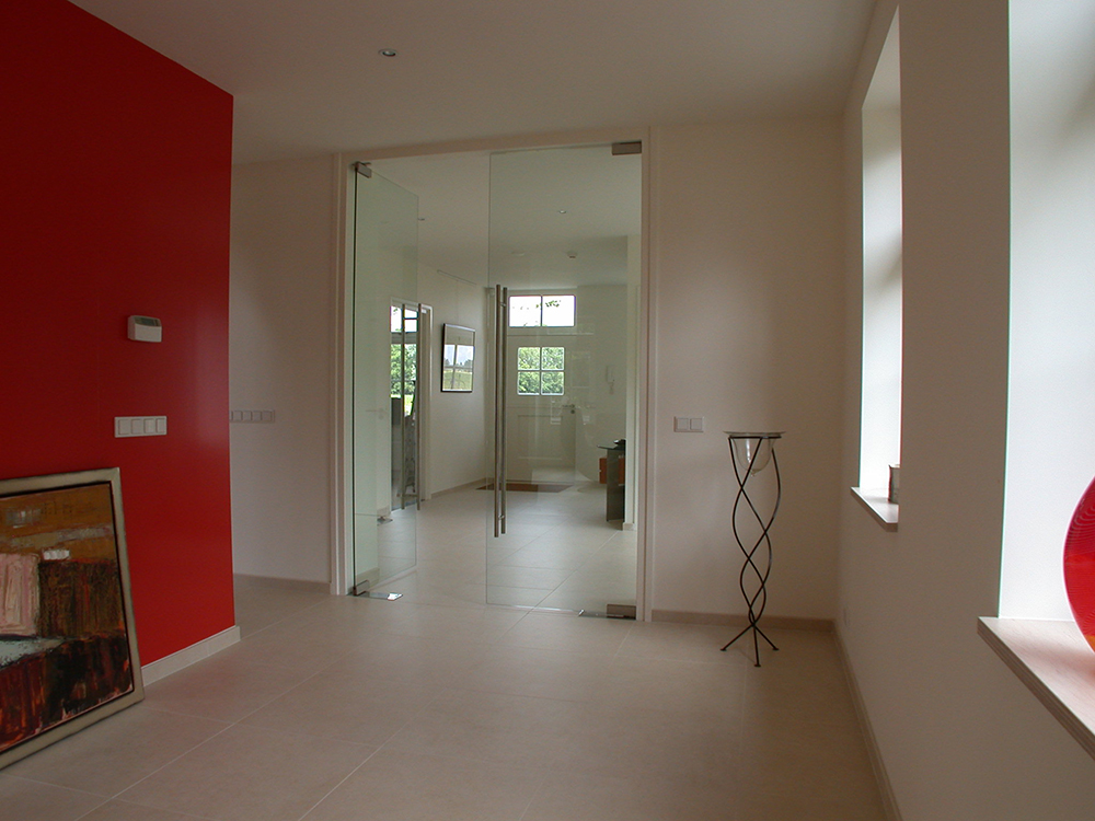 De nieuwe constructie-onderdelen zoals vloerliggers zijn in contrast met het bestaande vierkant uitgevoerd in verzinkt staal. Het hekwerk rond de vide is minimalistisch van rvs staaldraad. De tussendeuren vanuit de hoofdslaapkamer naar inloopkast en badkamer zijn van hardglas in een mat witte uitvoering.