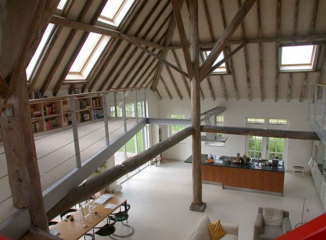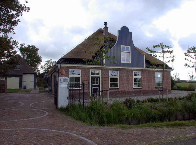 Een volledige verbouwing en herindeling van een bestaande stolpboerderij. Aan het exterieur is alleen de traditionele halsgevel toegevoegd. Over de bestaande kapconstructie die we in het zicht hebben gelaten zijn geïsoleerde dakplaten (melkwit gebeitst) aangebracht en nieuwe dakbedekking, riet met pannen.